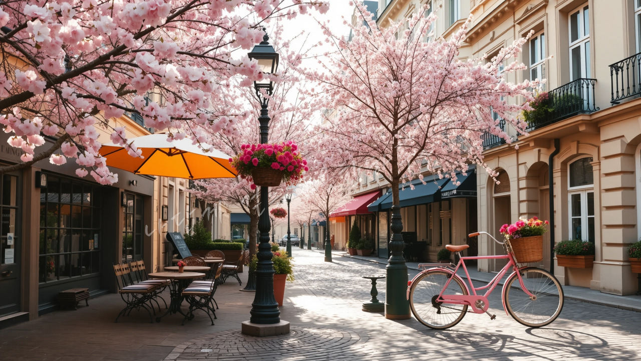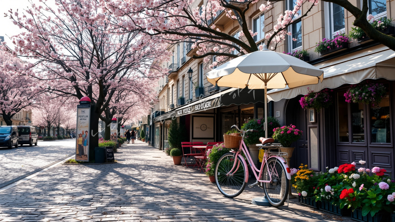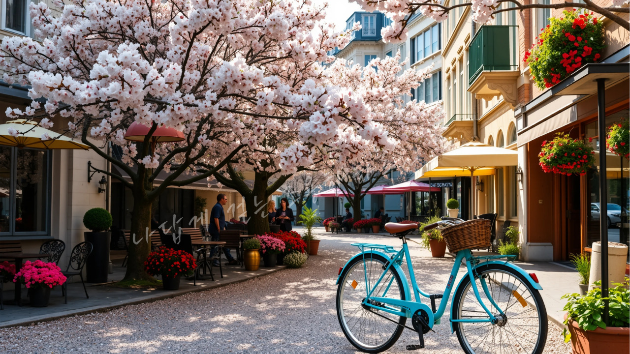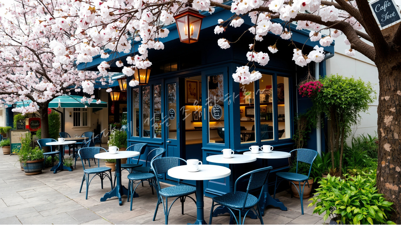 "연분홍 벚꽃이 가득한 거리, 오래된 유럽풍 파란색 카페, 아니 그냥 유럽풍 카페....