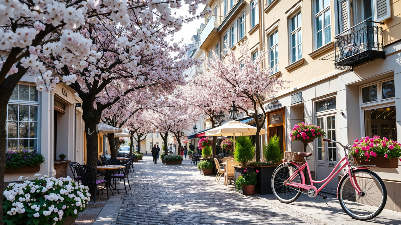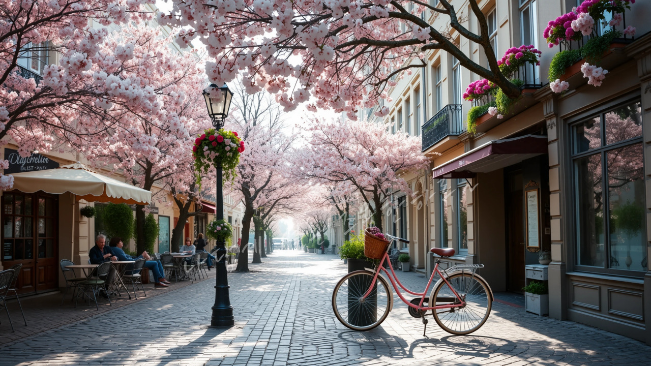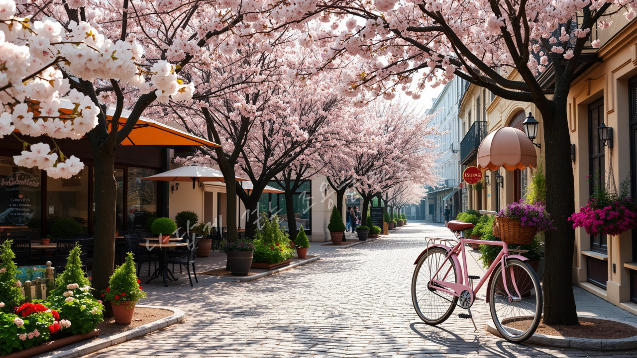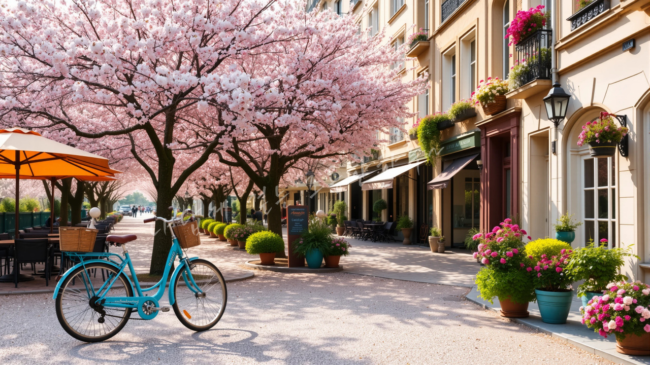 "연분홍 벚꽃이 가득한 거리, 오래된 유럽풍 파란색 카페, 아니 그냥 유럽풍 카페....