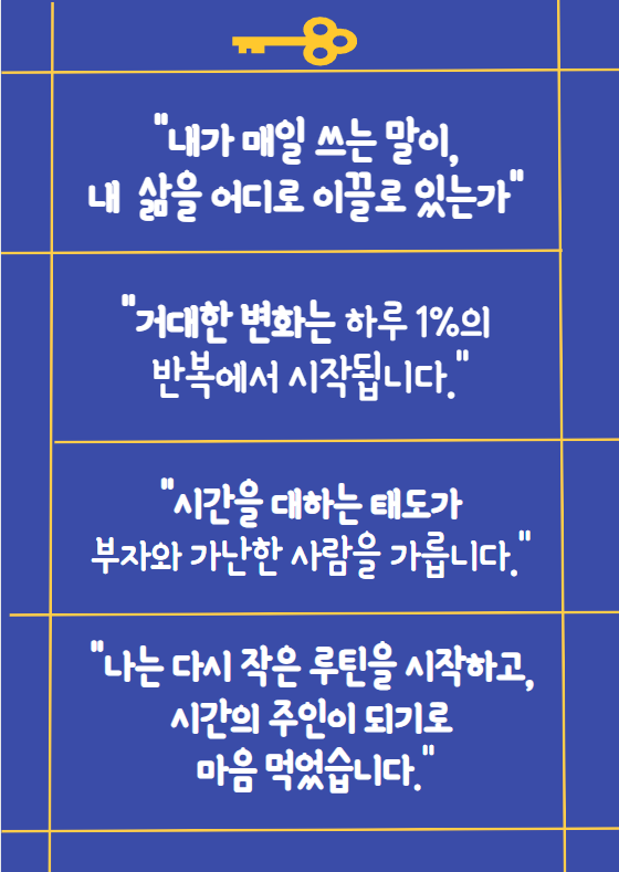 이제 저는 생각과 습관을 바꾸는 일이 곧 삶의 방향을 바꾸는 일이라는 것을 믿게 되었습니다. 부자의 언어는 결국 하루하루의 행동, 그리고 반복되는 생각 속에서 길러지는 것이라는 것을요.
